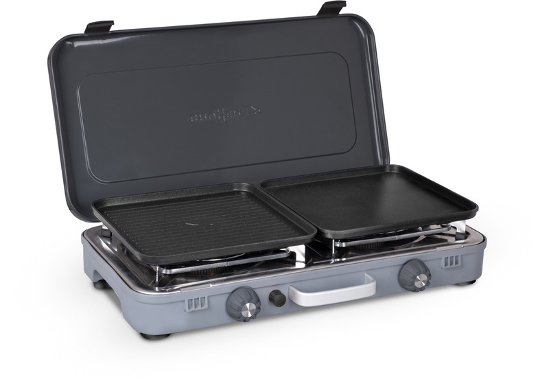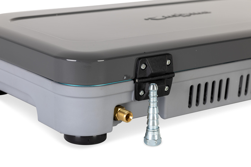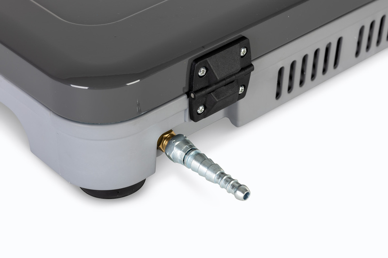 Compacto e transportável, mede 31 × 53,5 × 9,5 cm, com um peso de apenas 5,3 kg, sendo fácil de levar em carrinhas, autocaravanas ou até em aventuras mais leves. O Kookmaster GP inclui um queimador potente de alto desempenho, ajustável para controlar com precisão a intensidade do calor, garantindo que cada prato é cozinhado na perfeição.